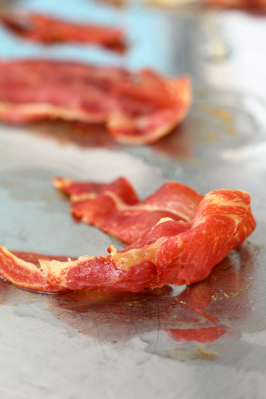 The first thing we're going to do crisp up our prosciutto. Place the prosciutto slices on a baking sheet. Then, bake it in the oven, at 425 degrees, for about 5 or so minutes. You want it crispy enough to break up into pieces. Once baked, allow the prosciutto to cool.