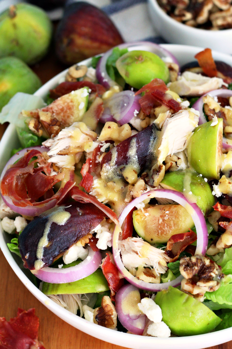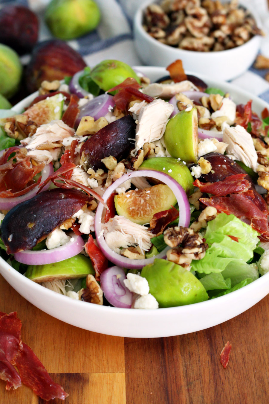 - Add lettuce, chicken, prosciutto, figs, onion, feta cheese, and walnuts to large salad bowl.
