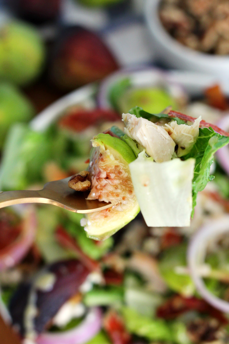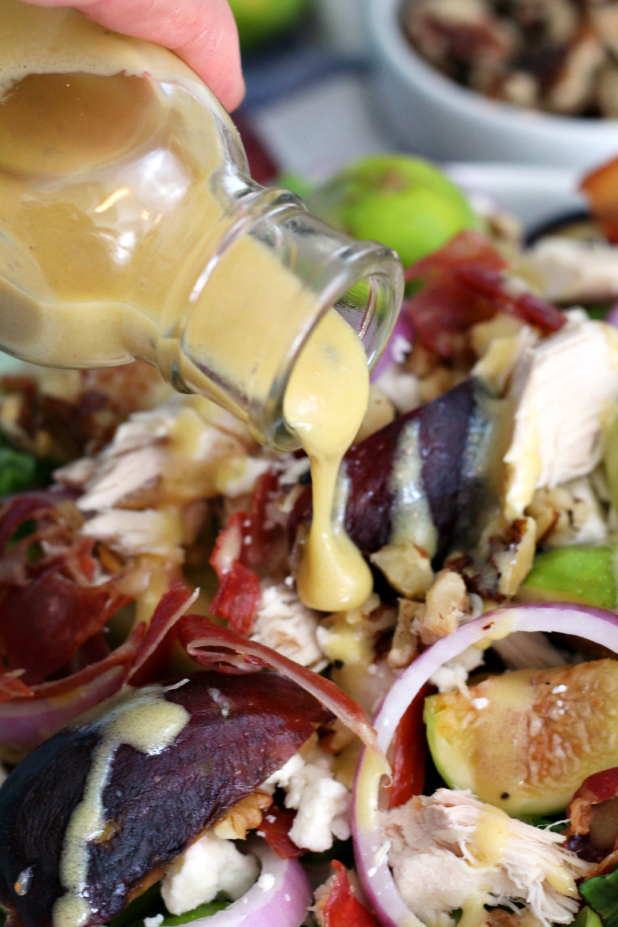 While we've been transitioning into more fall-like dishes, I've been adding oven-friendly meals back into our meal plan. Like rotisserie chicken. I'll reheat the chicken in the oven, then use the leftovers for lunches or an entirely different meal. That's how this salad came about. I used leftover rotisserie chicken and tossed in some fresh figs, along with a few other ingredients, and dressed it with a homemade honey mustard dressing.