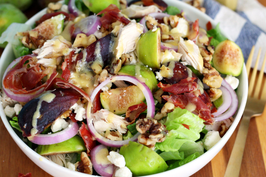 This hearty Harvest Chicken and Fig Salad is made on a bed with Romaine lettuce and topped with rotisserie chicken, fresh figs, crispy prosciutto, onion, feta cheese, walnuts, and a homemade honey mustard dressing.