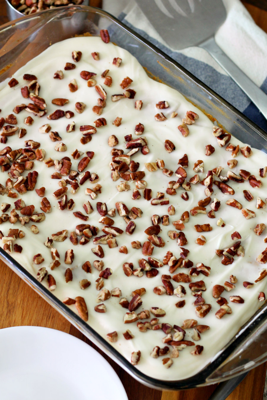 - Pour frosting over cake and spread evenly over top. Sprinkle with chopped pecans.