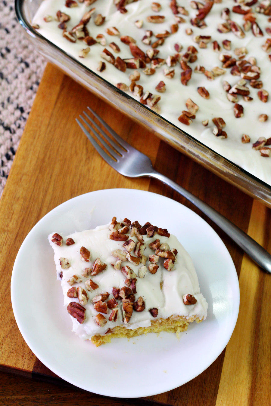 After we finished the cake, I started wondering about other dump cakes to make. With Mother's Day coming up, I thought it would be a great time to make a Hummingbird dump cake. This cake includes tropical flavors like pineapple and banana with cinnamon and a cream cheese frosting topped with pecans.