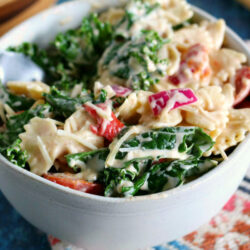 This Kale Caesar Pasta Salad is a perfect dish to meal prep and enjoy all week. It's a creamy, comforting twist on classic Caesar salad!