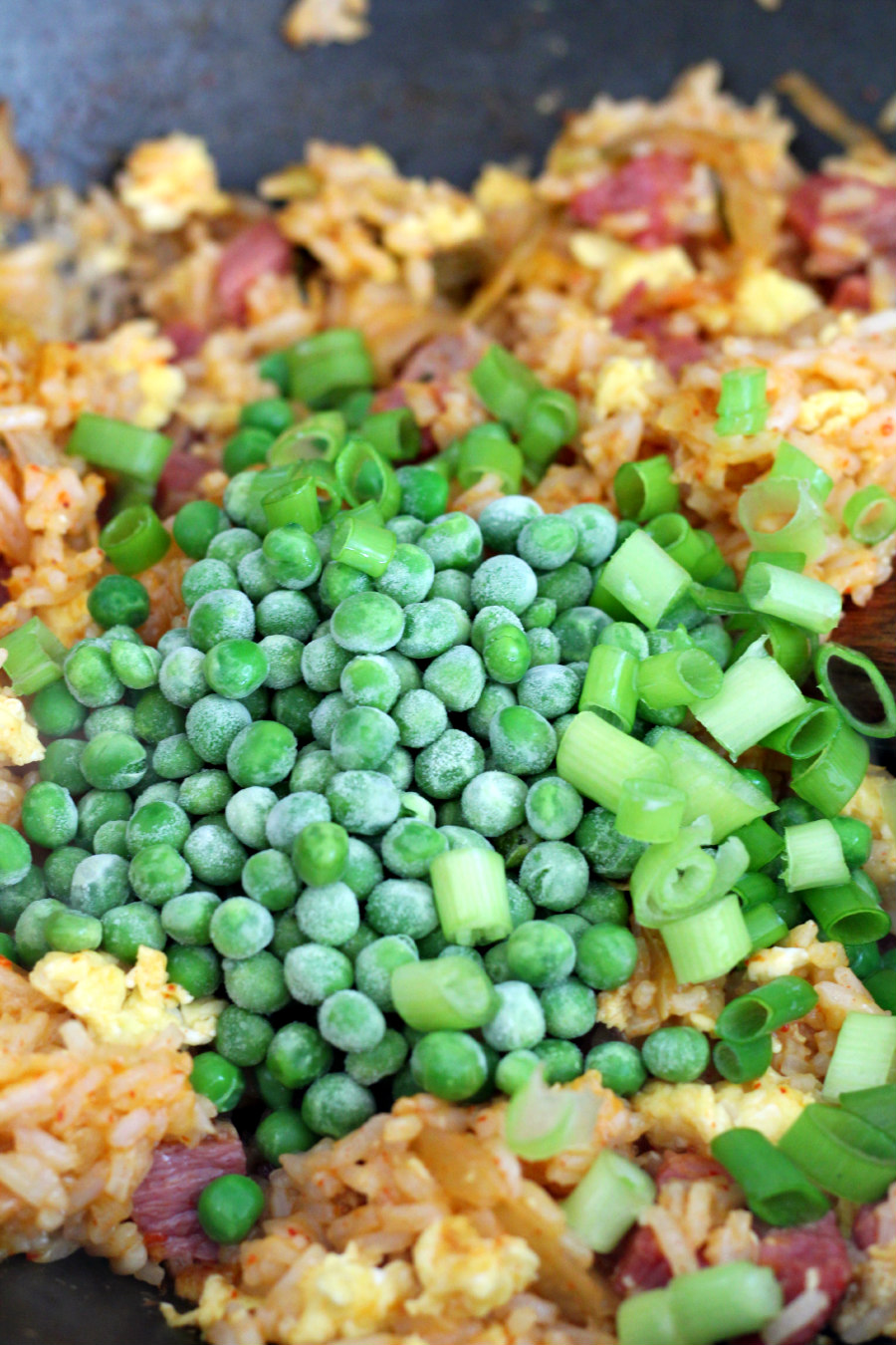 • Stir in peas and green onions. Once warmed through, serve fried rice.