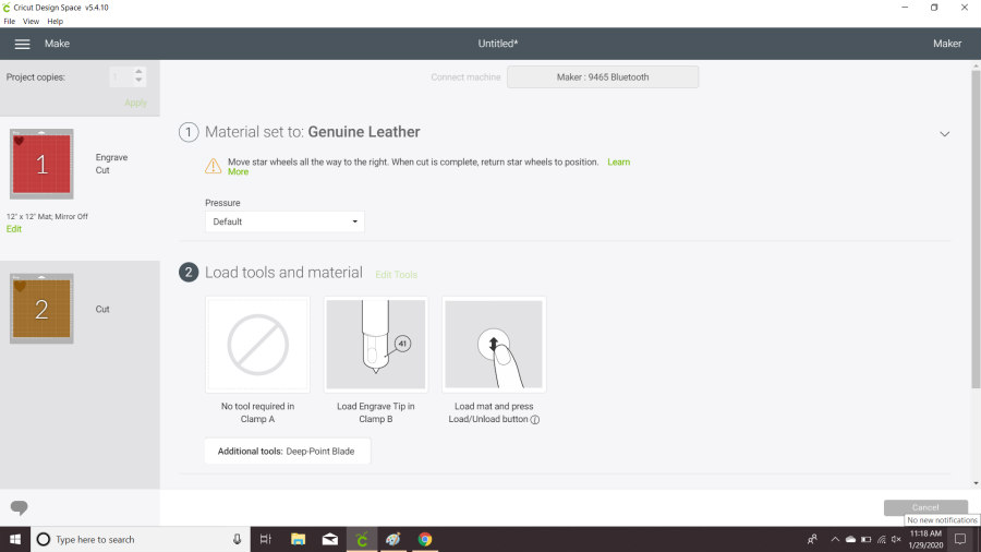 Continuing to the cut screen, I set my material and loaded my engrave tip. I placed a sheet of leather on a strong grip mat and taped the edges. Then, I loaded my mat into the machine and hit “go.”