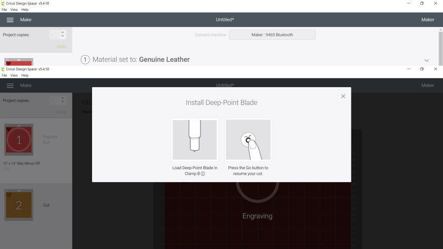 - Once the engraving is finished, remove the engraving tip from the machine and load the deep-point blade. Continue to cut.