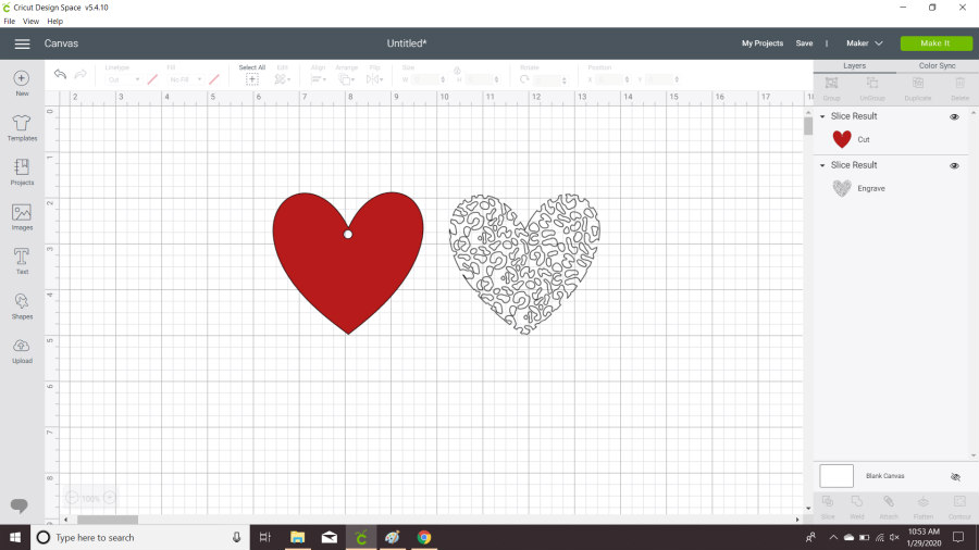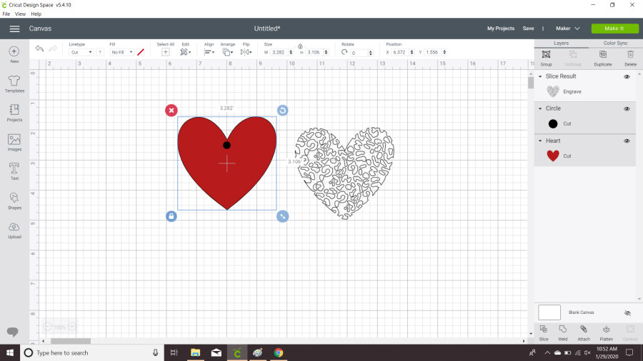 Once the pattern was cut, I went back and made the original heart red. To make a hole to hang the pendant, I selected a circle from the shapes option and used the slice tool again to create the hole.