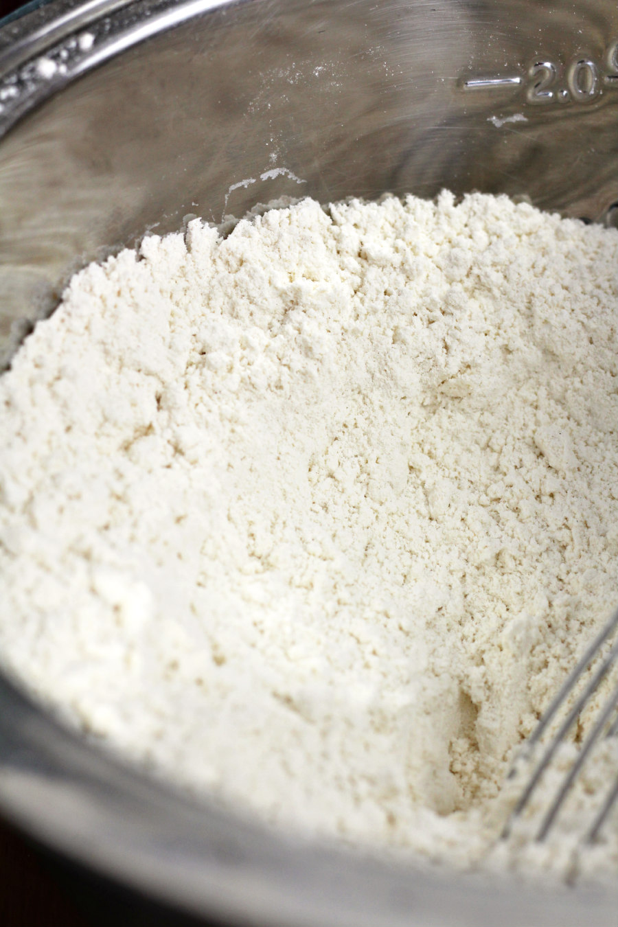 - Add flour, baking soda, baking powder, and salt to a medium mixing bowl. Mix to combine and set aside.