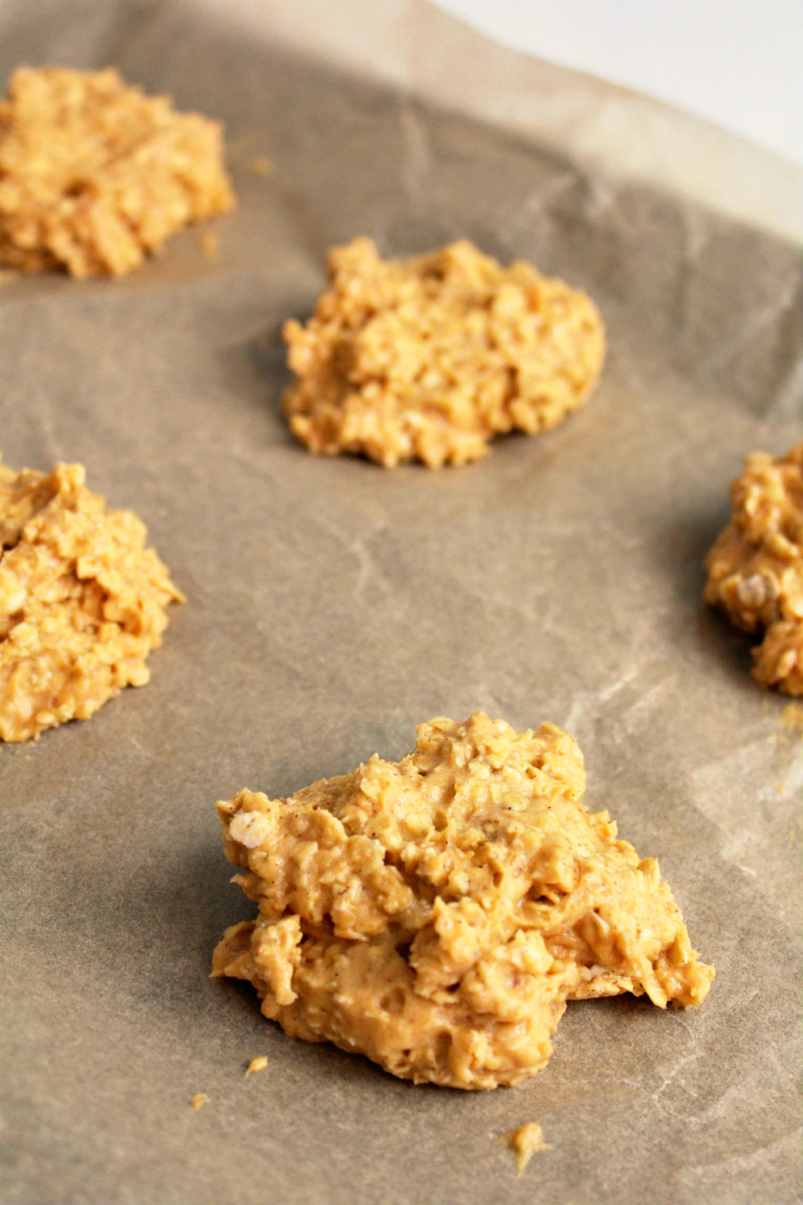 • Drop batter onto cookie sheets in heaping 1 tbsp. spoonfuls and slightly flatten dough down with your fingers. Leave 1 inch between cookies.