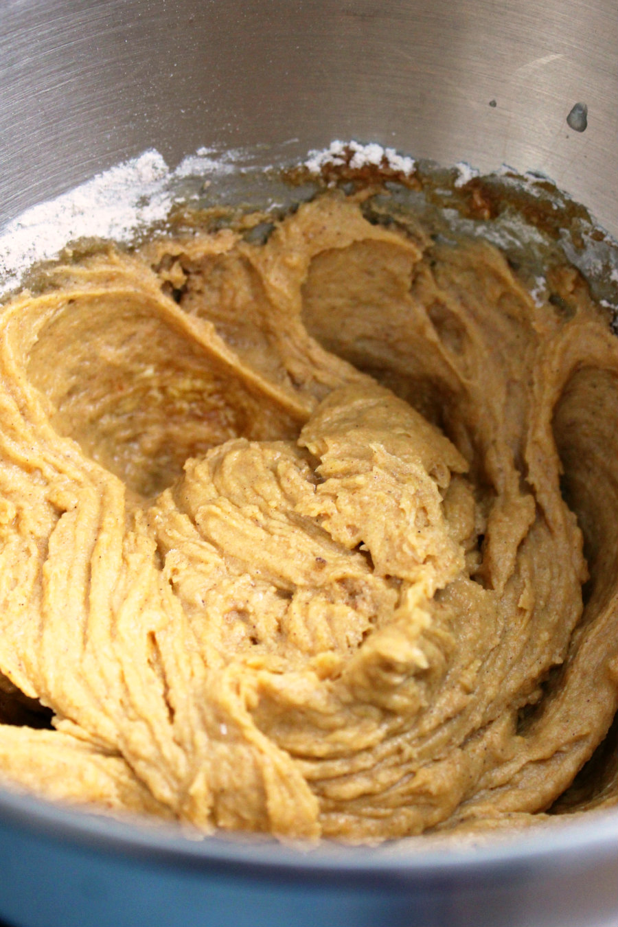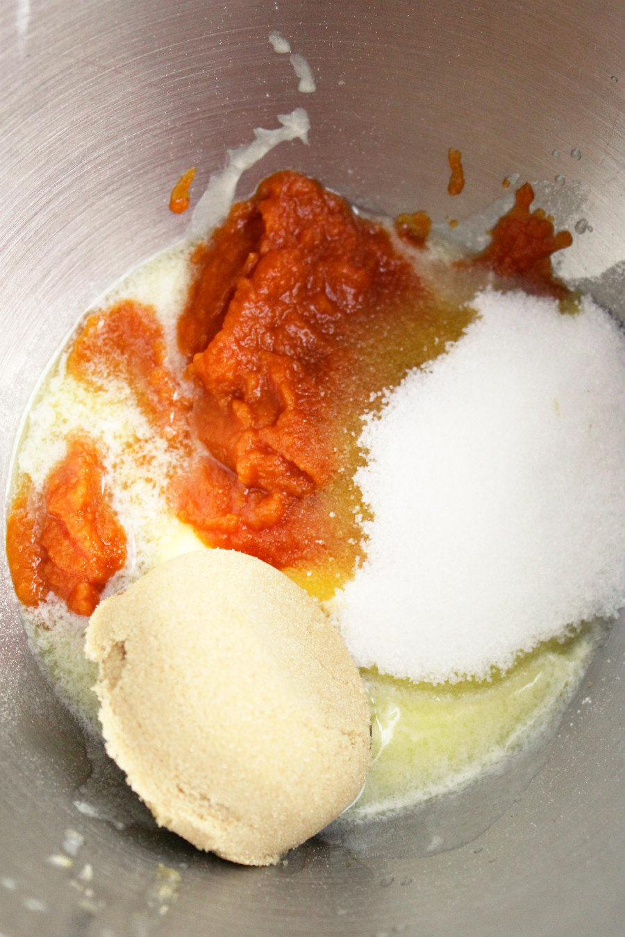 • In a mixer bowl, add butter, pumpkin puree, brown sugar, and white sugar. Beat on low speed until combined.