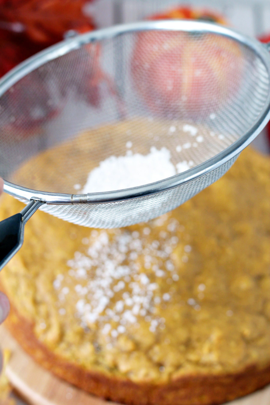 Like the pistachio version of this cake, I actually recommend making it a day ahead of time. It really does seem to taste even better the next day! Then, once you're ready to serve, sprinkle powdered sugar on top. You could also add a dollop of cinnamon spiced whipped cream on top, as well.