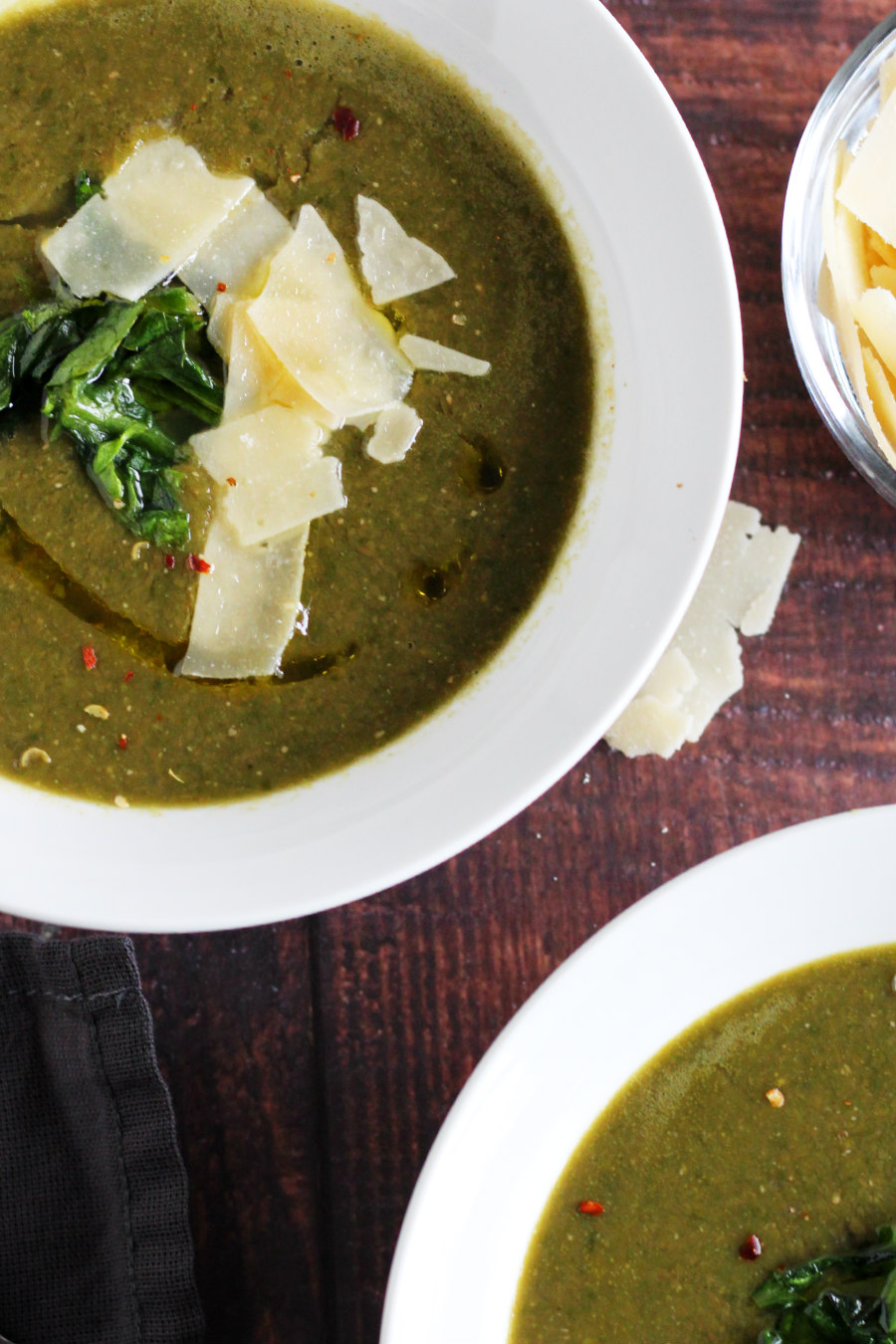 - Spoon soup into bowls, drizzle with olive oil, top with more sauteed escarole, crushed red pepper, and shaved Parmesan cheese.