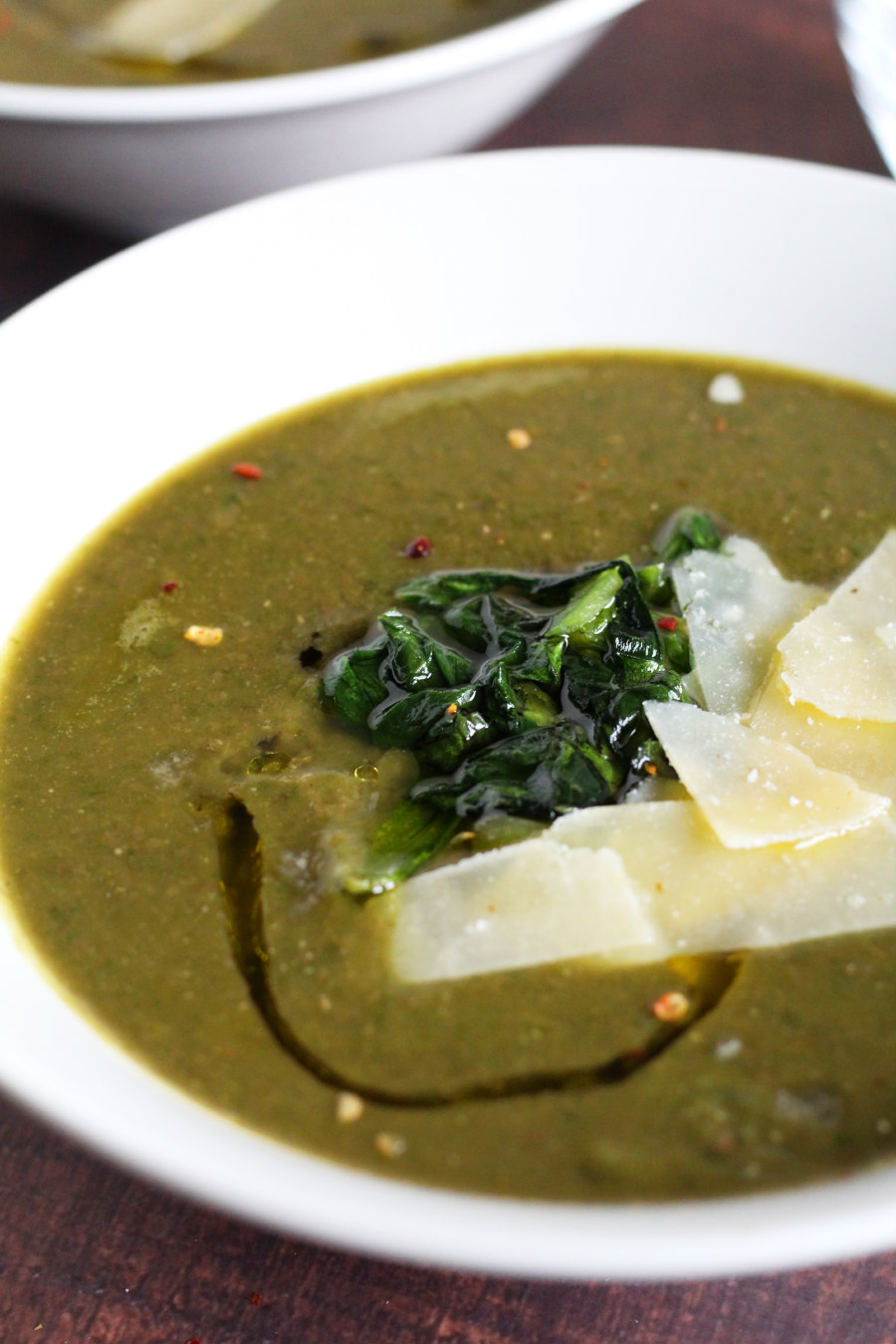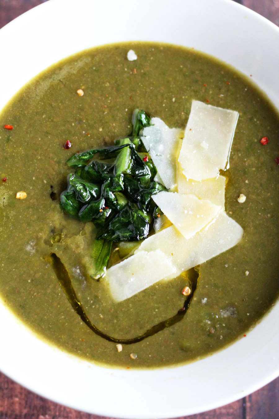 Warm up with a thick and comforting bowl of Pureed Lentil Soup with Escarole made with Italian style ingredients like onion, garlic, fresh escarole, and shaved Parmesan.