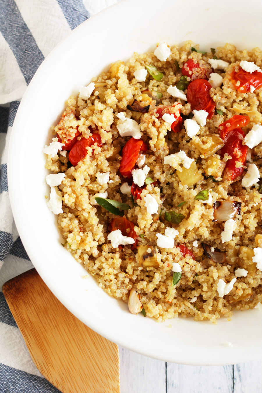 So far, I've made eggplant Parmesan, breaded and fried it to throw on top of pizza, and made this quinoa salad. It's going to be the summer of eggplant and I'm totally okay with that!