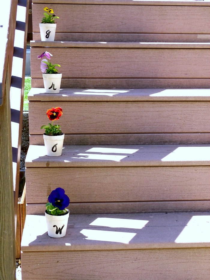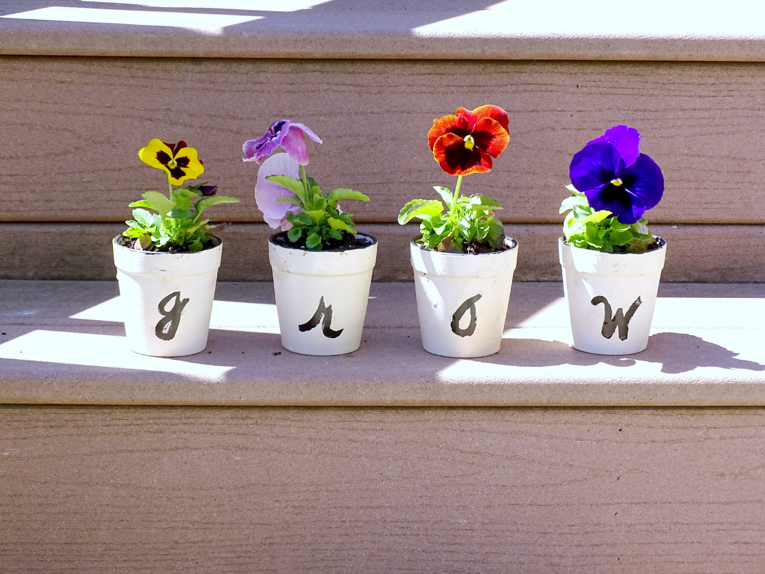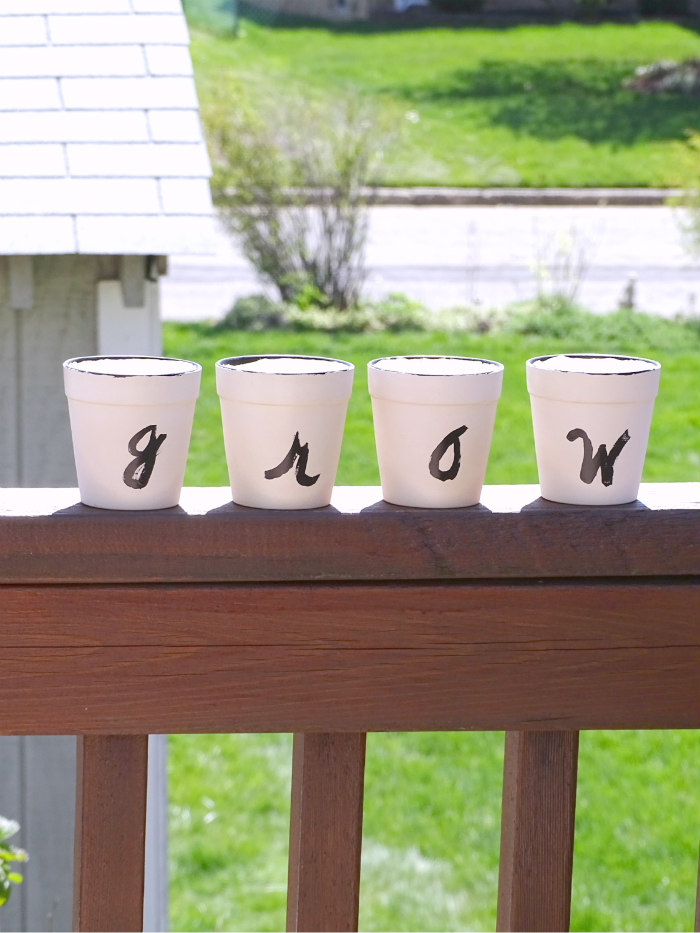 - Using very little black paint, spell out G-R-O-W across four pots. Allow paint to dry.