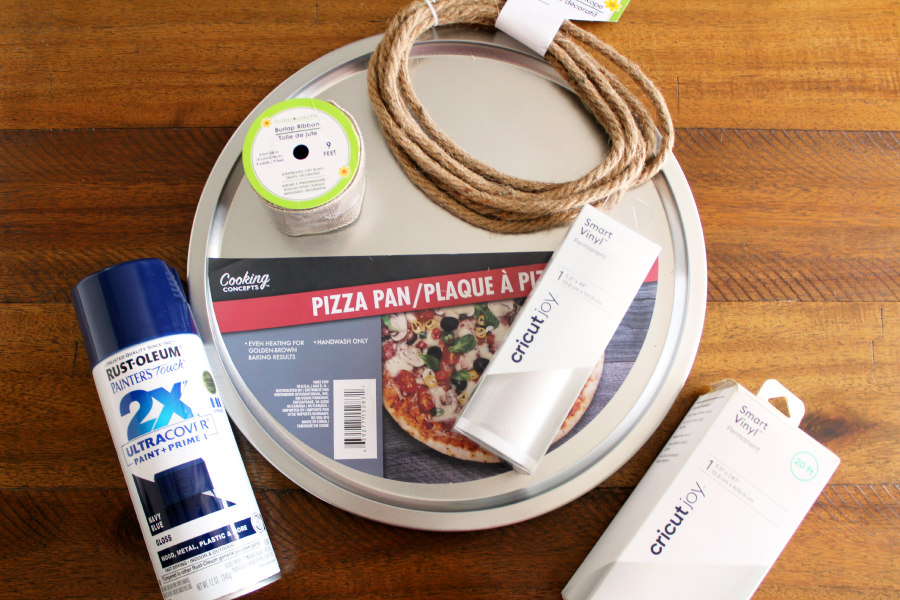 Pizza pan wreaths are a budget-friendly way to create a totally customizable door hanger for your front door. All you need is a pizza pan, some spray paint, nautical rope, and vinyl. If you're a Cricut crafter, you probably have most of the vinyl you'll need in your craft room already! And the majority of what's left on the list can be grabbed at the dollar store!