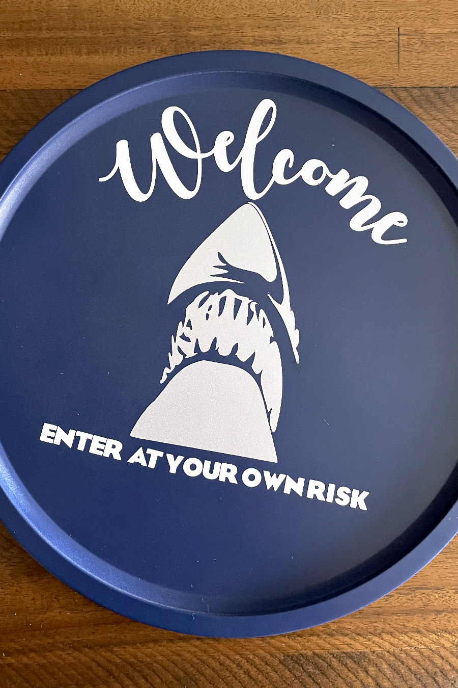 I remembered the Nautical Pizza Pan Wreath that I made for my sister. It seemed easy enough to use that same nautical vibe on a shark themed pizza pan wreath. So I headed to the dollar store for supplies and started to create a shark design using my Cricut Joy and Smart Vinyl™.