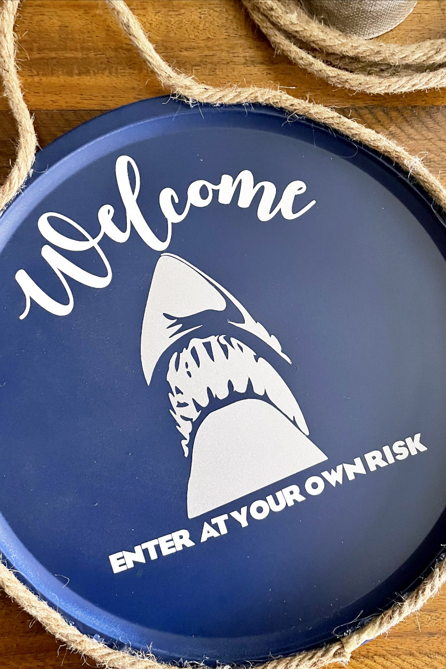 Give your guests a fin-tastic welcome with this easy Shark Pizza Pan Welcome Wreath made with dollar store supplies and the Cricut Joy!
