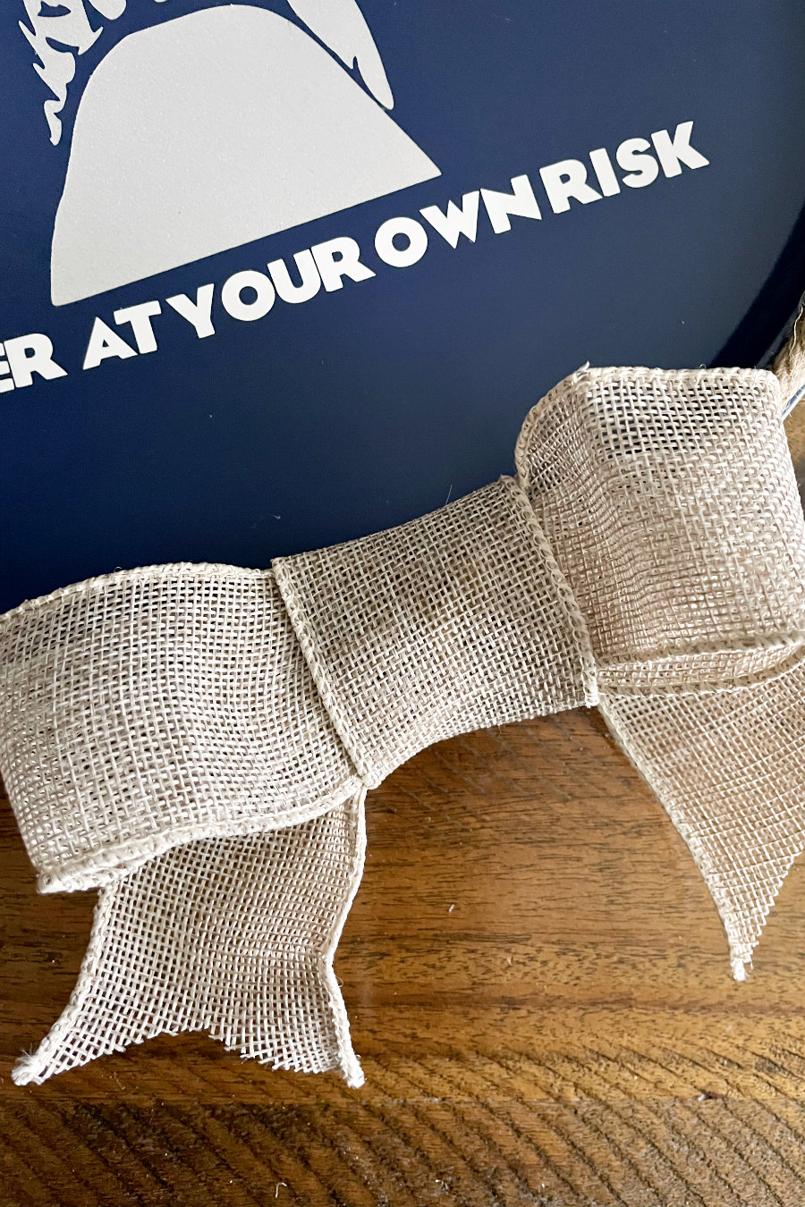 - Add a burlap bow to the pizza pan wreath, if desired. Then, hang your new wreath once the glue has dried!
