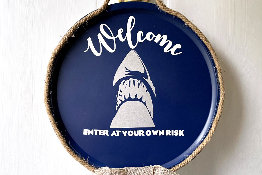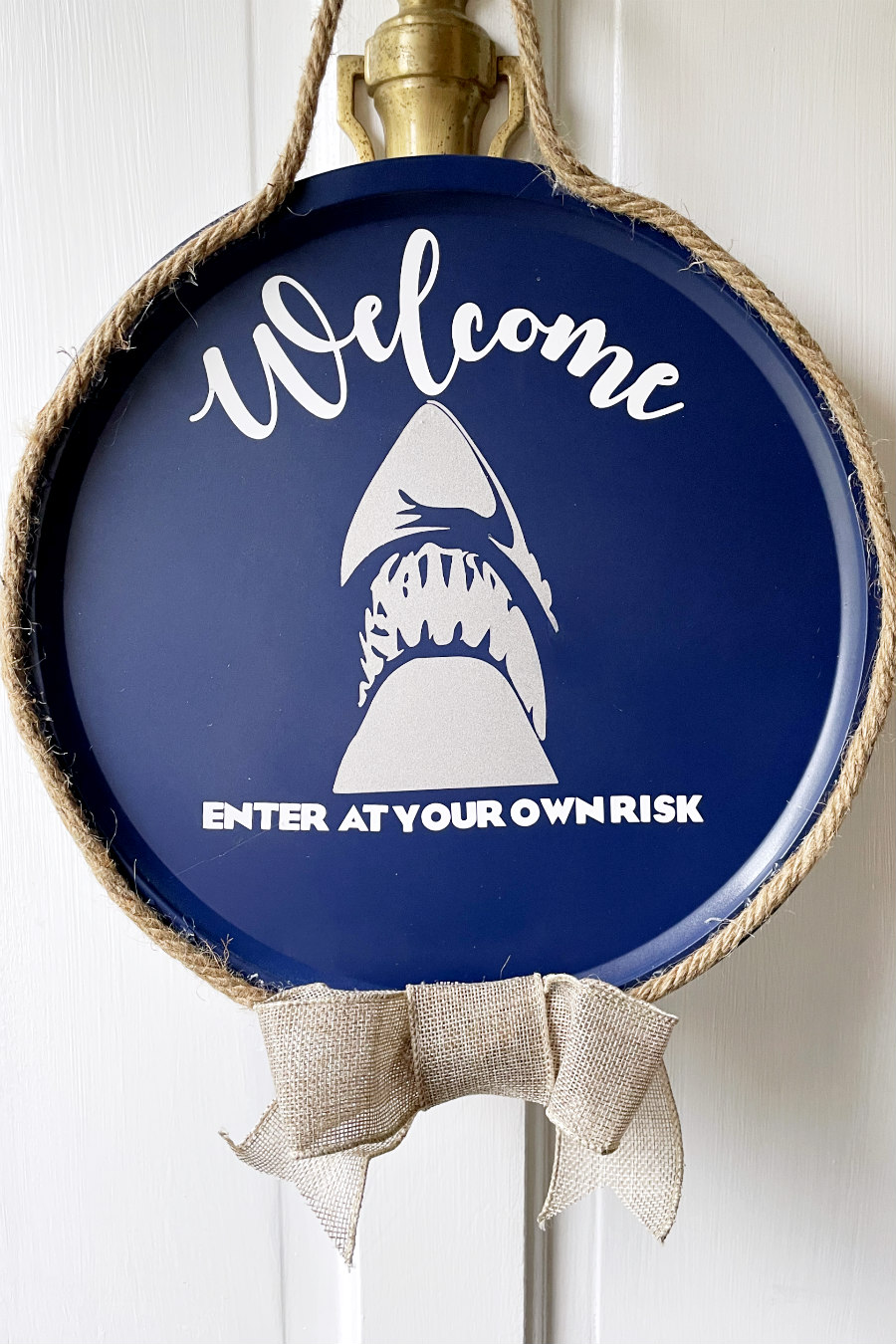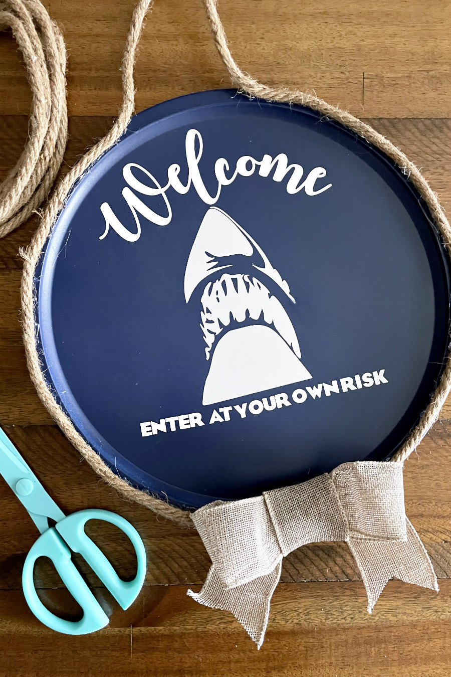This shark wreath project is really easy to put together! As long as you wait for the paint to completely dry and have patience when sticking the vinyl onto the pan, you should have no problem creating this fin-tastic wreath for your door!
