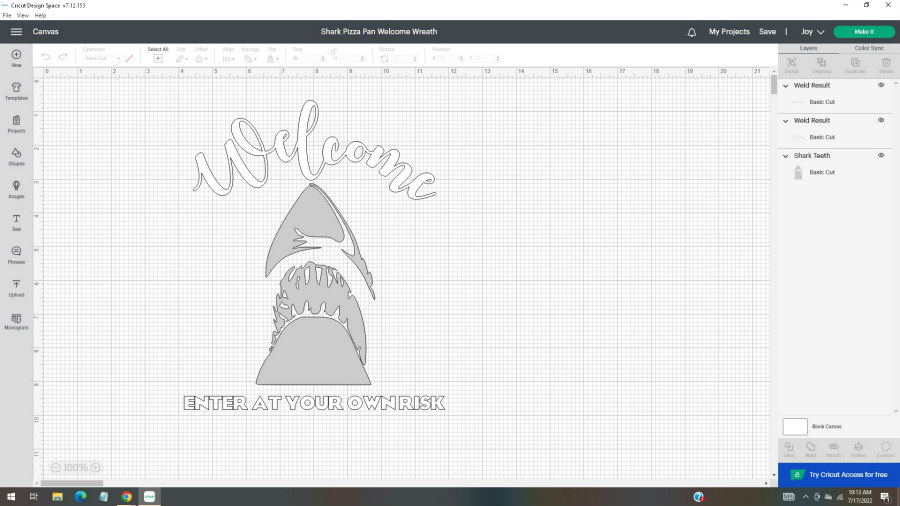 - Open the Shark Pizza Pan Wreath Project in Design Space. Resize, if necessary. Then, click “make it.”