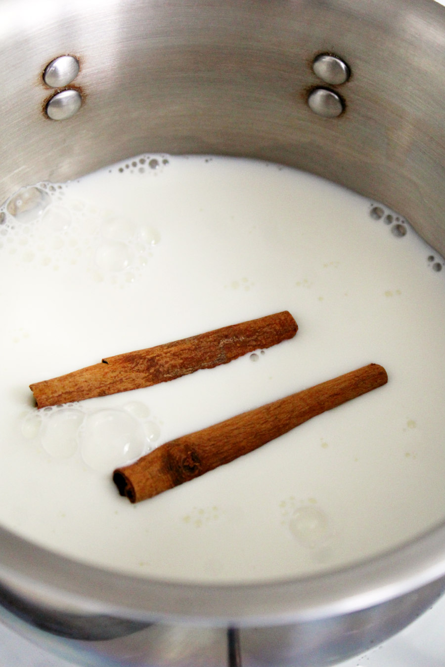 The first thing we need to do is make our cinnamon infused milk. Seriously so easy to do! Just add a couple cinnamon sticks to a small pot of milk and heat it for about 5 minutes. You could even make a big batch and store it in the fridge to use all week!