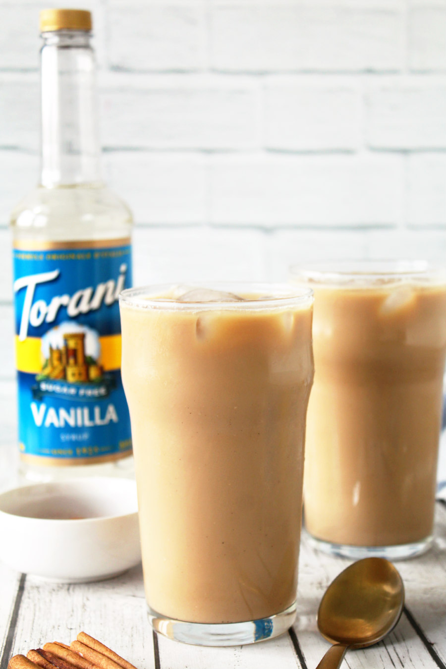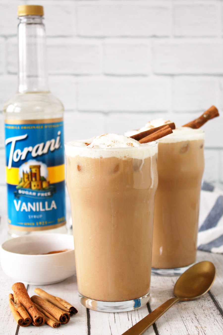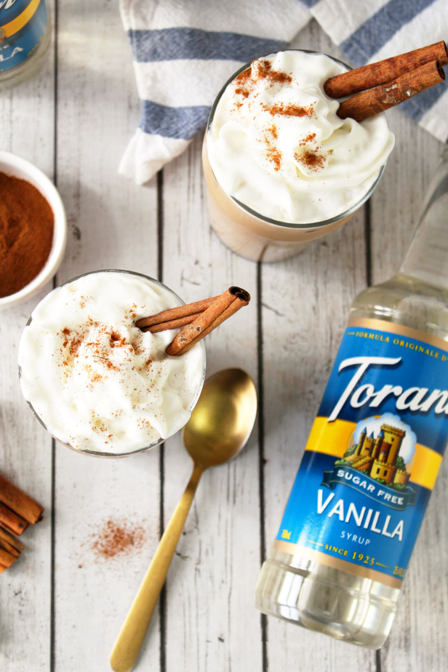 - Stir in the Sugar Free Torani Vanilla Syrup and cinnamon infused milk.