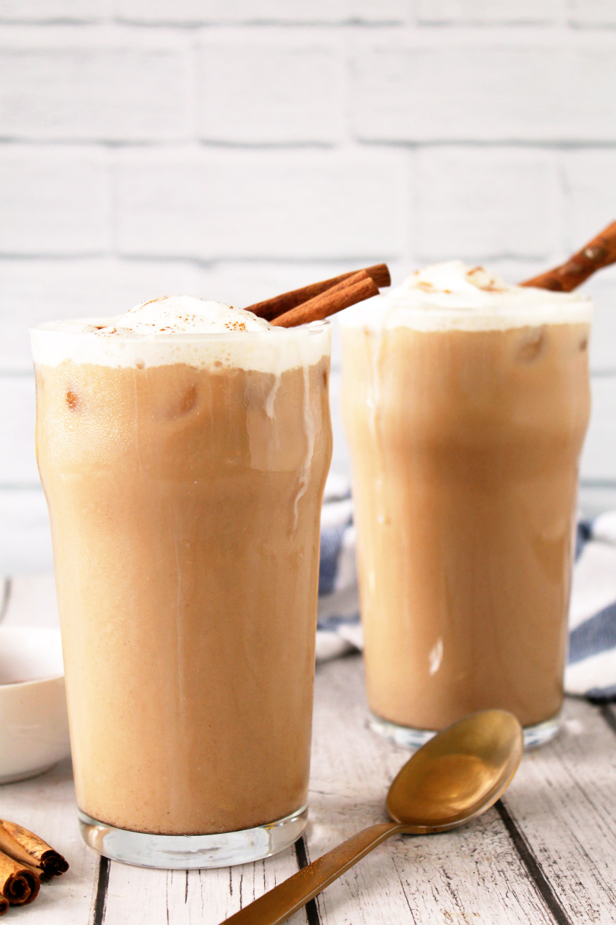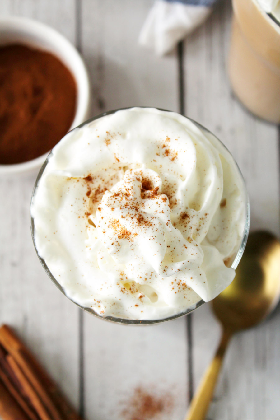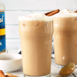 Save what's left of your morning pot of coffee to make this churro inspired iced coffee. It's made with cinnamon infused milk, Torani Sugar Free Vanilla Syrup, and an optional (but totally recommended) dollop of cinnamon sprinkled fat free whipped cream on top!