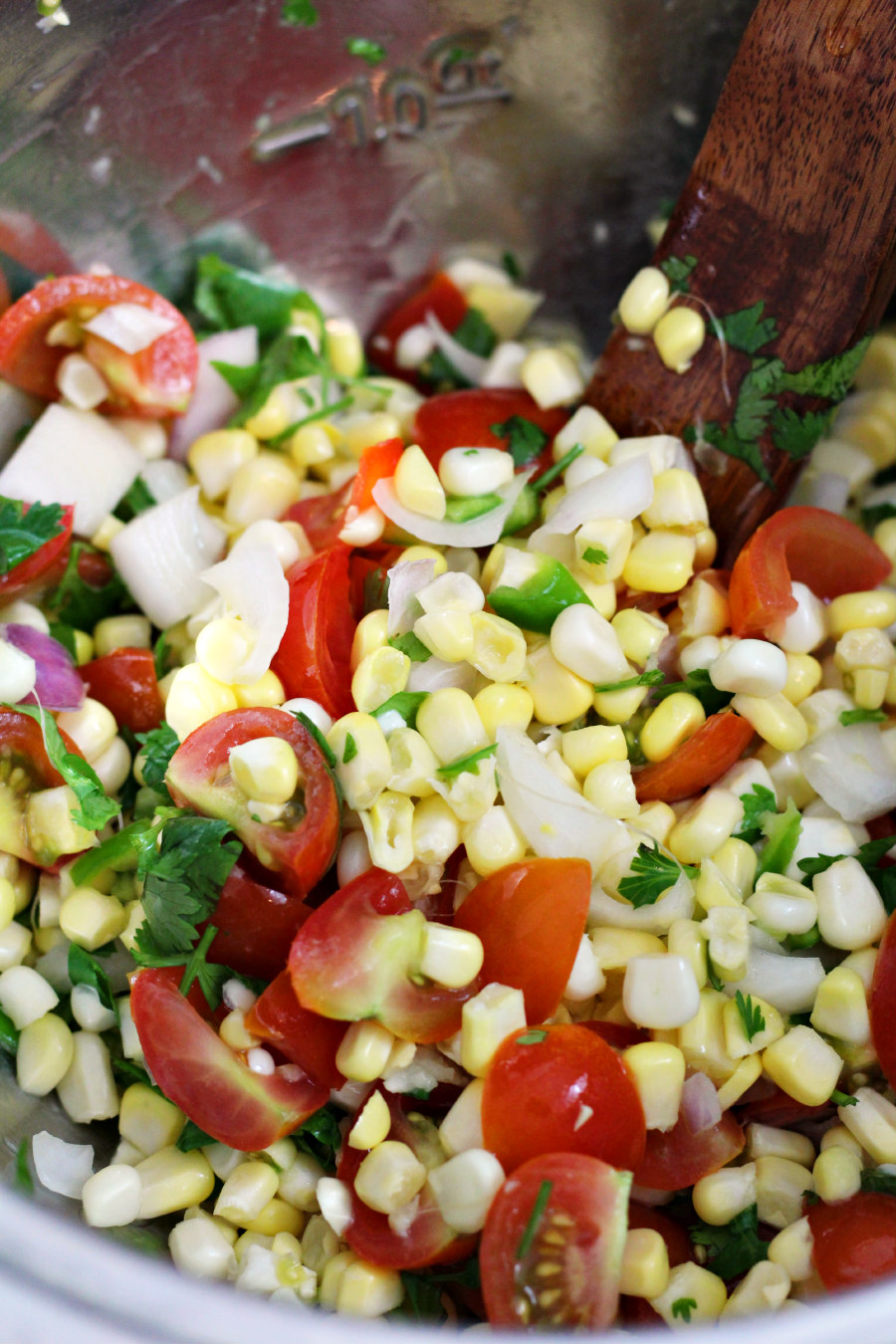 - In a medium mixing bowl, add the corn, tomatoes, onion, jalapeño, and cilantro. Mix to combine.