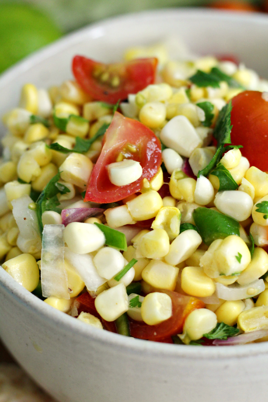 I had a few ears of corn to use up in my fridge, so I decide to make a summery salsa - very corn-forward with a combination of fresh cherry tomatoes, red onion, heatless jalapeño (of course, you can use regular jalapeños, but I have the heatless ones growing out back), cilantro, lime juice, and seasonings. Incredibly fresh, so flavorful, and perfect for summer snacking!