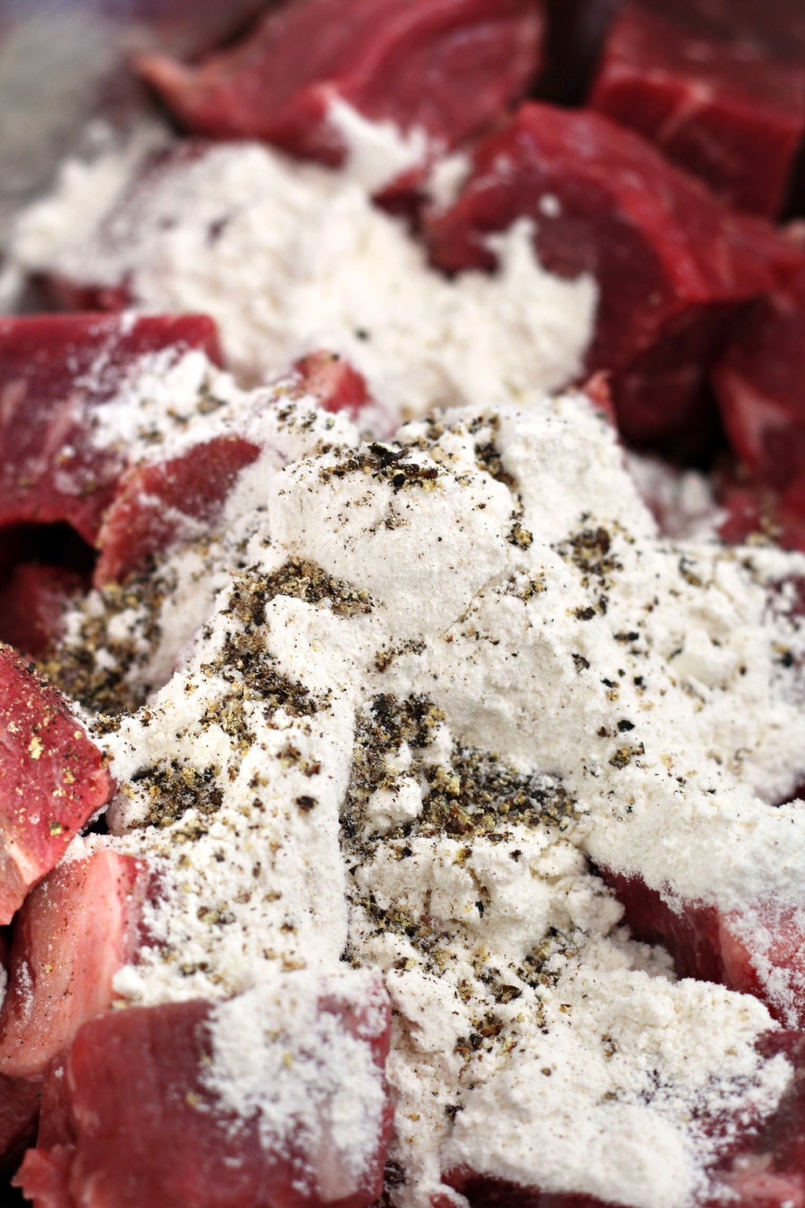 - In a large mixing bowl, add the beef chunks and season with salt and pepper. Sprinkle with flour and toss the beef to coat.
