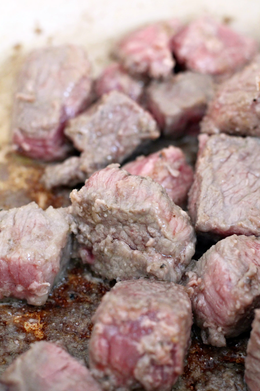 The beef doesn't have to be all the way cooked at this stage. It just needs to be browned since it will continue cooking once the stew is put together.