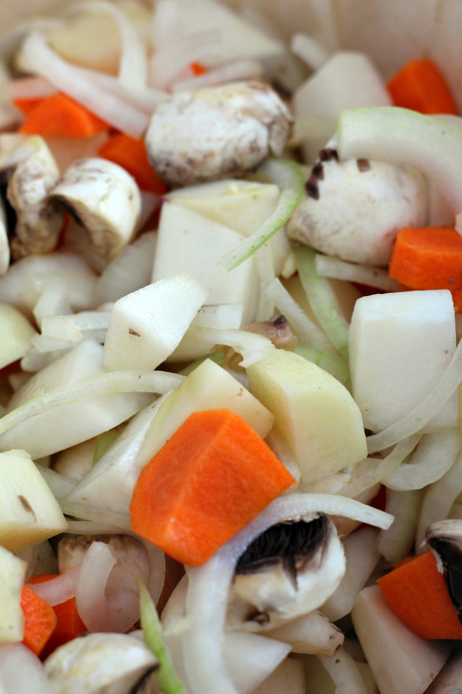 Next, add turnips, onion, garlic, carrots, potatoes, and mushrooms to the pot. Cook them for about 3-4 minutes, just so the onion and garlic get fragrant.