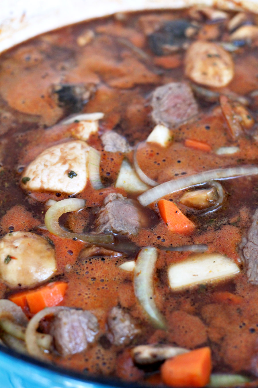 Bring the pot to a simmer. Scrape any brown bits from the bottom of the pot. Then, add the beef to the pot, cover, and allow it to cook for at least an hour, but two is definitely better.