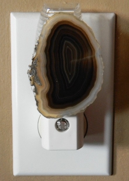 Agate stones add a natural element to DIY projects.  I’ve used them in the past to make garden markers and candle holders.  This one-of-a-kind agate night light takes minutes to make!  All you need is an agate slice, a night light with a clear plastic shade and some heavy duty glue.