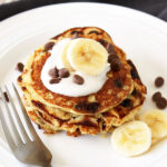 Serve pancakes with yogurt, sliced bananas, and more carob chips on top, if desired.