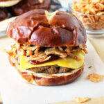 At this time, also add the pretzel buns cut-side-down onto the grill and allow them to get toasty.