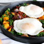 In a small pan, cook eggs to your preference. Then, place them on top of skillet, season with salt and pepper, and serve.