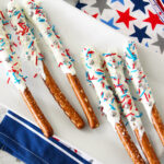 Place dipped pretzels onto prepared baking sheet. Sprinkle pretzel with silver sugar sprinkles. Follow with the patriotic sprinkle mix.