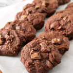 Add the remaining chopped peanut butter cups on top and gently press them into the cookie dough.