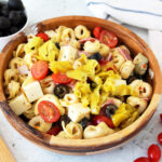 This Easy Italian Tortellini Pasta Salad is a quick side dish made with bold Italian flavors like cheese tortellini, salami, artichokes, onions, mozzarella, black olives, tomatoes, and Italian dressing!