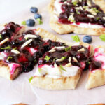 This Grilled Blueberry Dessert Pizza is topped with cream cheese frosting, a fresh blueberry topping, powdered sugar, lemon zest, and fresh mint. It’s a deliciously sweet way to use juicy summertime blueberries!