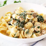 This orecchiette pasta is a quick and tasty dish made with crumbled chicken sausage and kale in a light, but deliciously creamy sauce.