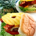 Top burgers with a slice of Pepper Jack cheese, Sriracha mayo, bacon, a slice of pineapple, lettuce, and tomato.