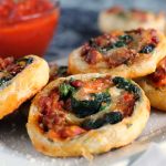 Start by spreading the garlic and spinach on top. Then, add the sausage and sprinkle the cheese on top. Finish with 1/4 cup of the pizza sauce, reserving the rest for dipping.