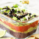 This Vegan Layered Black Bean Dip is made with five flavorful layers of beans, guacamole, salsa, cashew cheddar, and lettuce and served with tortilla chips!